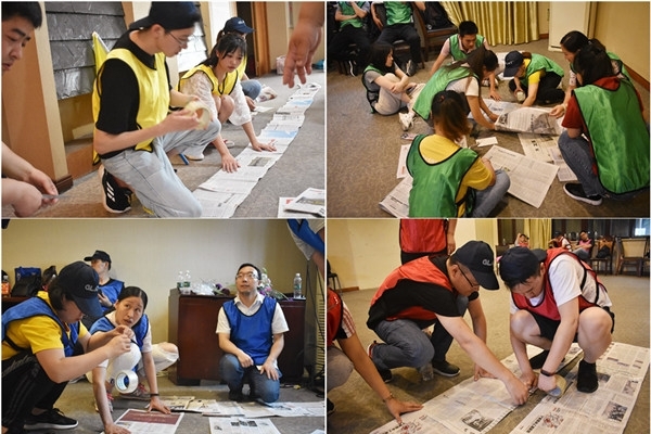 報紙成為了“履帶”,成員們利用膠帶,將“履帶成形”,在接下來的行進中可不能斷了,“盡可能牢固!!”