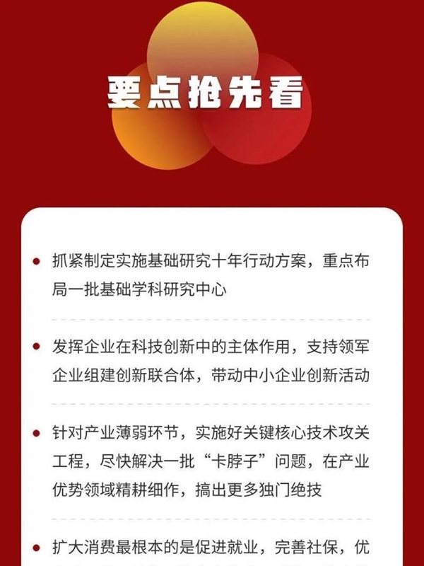 四是全面推進改革開放。構建新發展格局,必須構建高水平社會主義市場經濟體制,實行高水平對外開放,推動改革和開放相互促進。要完善宏觀經濟治理,加強國際宏觀政策協調。要深入實施國企改革三年行動,優化民營經濟發展環境,健全現代企業制度,完善公司治理,激發各類市場主體活力。要放寬市場準入,促進公平競爭,保護知識產權,建設統一大市場,營造市場化、法治化、國際化營商環境。要健全金融機構治理,促進資本市場健康發展,提高上市公司質量,打擊各種逃廢債行為。要規范發展第三支柱養老保險。要積極考慮加入全面與進步跨太平洋伙伴關系協定。要大力提升國內監管能力和水平,完善安全審查機制,重視運用國際通行規則維護國家安全。