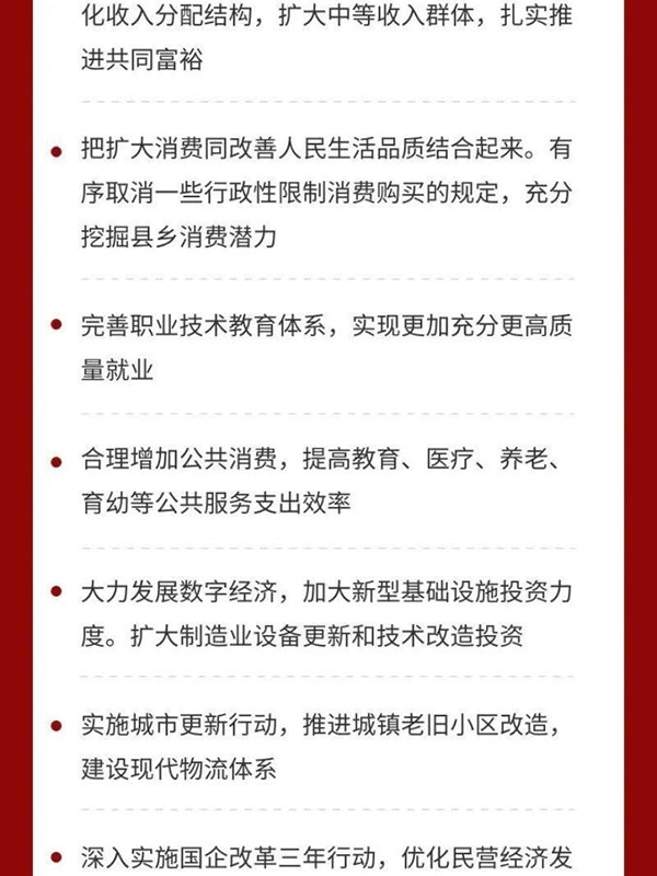 三是堅持擴大內需這個戰略基點。形成強大國內市場是構建新發展格局的重要支撐,必須在合理引導消費、儲蓄、投資等方面進行有效制度安排。擴大消費最根本的是促進就業,完善社保,優化收入分配結構,擴大中等收入群體,扎實推進共同富裕。要把擴大消費同改善人民生活品質結合起來。有序取消一些行政性限制消費購買的規定,充分挖掘縣鄉消費潛力。要完善職業技術教育體系,實現更加充分更高質量就業。要合理增加公共消費,提高教育、醫療、養老、育幼等公共服務支出效率。要增強投資增長后勁,繼續發揮關鍵作用。要發揮中央預算內投資在外溢性強、社會效益高領域的引導和撬動作用。激發全社會投資活力。要大力發展數字經濟,加大新型基礎設施投資力度。要擴大制造業設備更新和技術改造投資。要實施城市更新行動,推進城鎮老舊小區改造,建設現代物流體系。要加強統一規劃和宏觀指導,統籌好產業布局,避免新興產業重復建設。