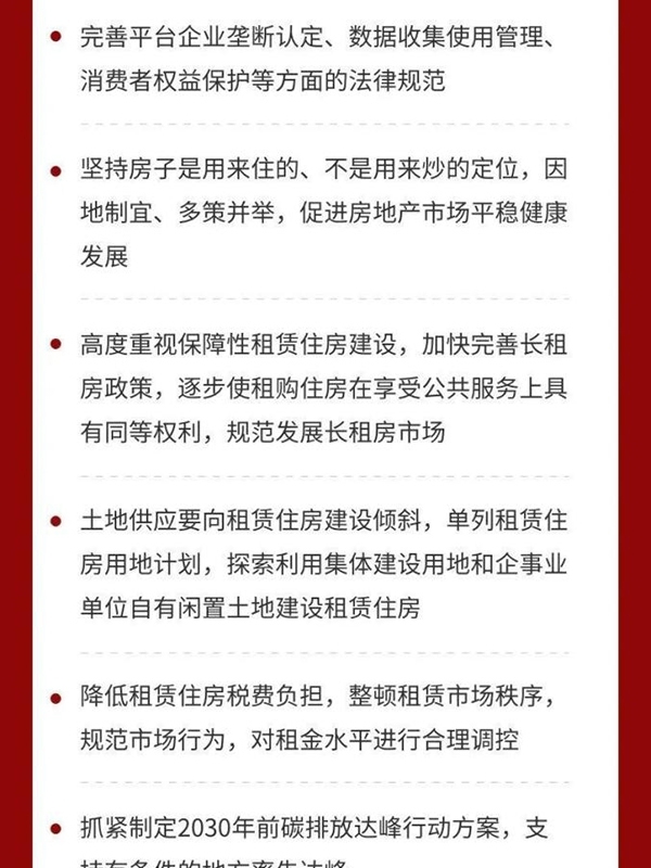 七是解決好大城市住房突出問題。住房問題關系民生福祉。要堅持房子是用來住的、不是用來炒的定位,因地制宜、多策并舉,促進房地產市場平穩健康發展。要高度重視保障性租賃住房建設,加快完善長租房政策,逐步使租購住房在享受公共服務上具有同等權利,規范發展長租房市場。土地供應要向租賃住房建設傾斜,單列租賃住房用地計劃,探索利用集體建設用地和企事業單位自有閑置土地建設租賃住房,國有和民營企業都要發揮功能作用。要降低租賃住房稅費負擔,整頓租賃市場秩序,規范市場行為,對租金水平進行合理調控。