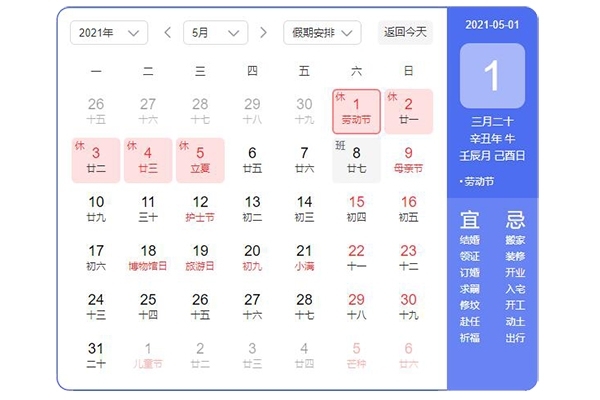2021年5月1日-5月5日放假調(diào)休,共5天。5月8日(星期六)我們正常上班。節(jié)前各位同事安排好工作,配合行政做好清潔打掃工作,檢查好電源開關(guān),關(guān)好門窗。節(jié)日期間,請(qǐng)大家注意人身安全和財(cái)產(chǎn)安全,愉快的度過假期。