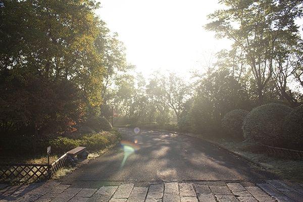 小鎮還未蘇醒,我們去迎接這份晨光,清晨的太陽冉冉升起,蔚藍色的天空分外惹眼,這份色彩是我們平日難以見到的光景。太陽是那么耀眼,你沒辦法與他對視,透過指縫,穿過林間,照耀在大地,石階小板抹上了斑駁的金色,所以你才知道,“嗯,太陽,他原來就在那里。”