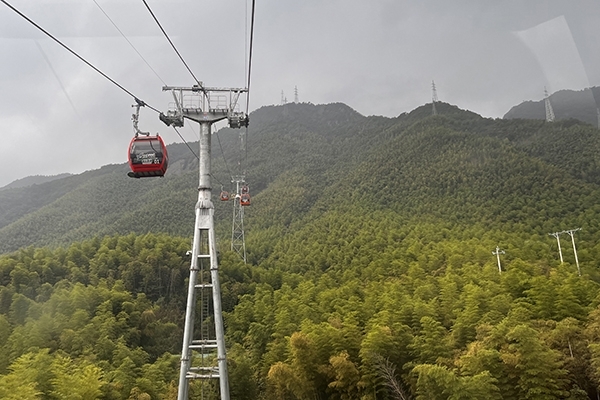 經(jīng)過2個(gè)小時(shí)的車程,我們到達(dá)山腳下,但是又該怎么穿過群山,到達(dá)云端?答案就在下面,索道帶我們一步步接近秋空。這是一個(gè)2.3公里長(zhǎng)的路程,43度至大傾角,落差有754米。坐在吊廂,一路領(lǐng)略那綠油蔥蔥。20分鐘的空中索道旅途,“↗→↘”,這就是我們經(jīng)過的姿勢(shì),由下而上、由仰到俯,過癮!!!!!