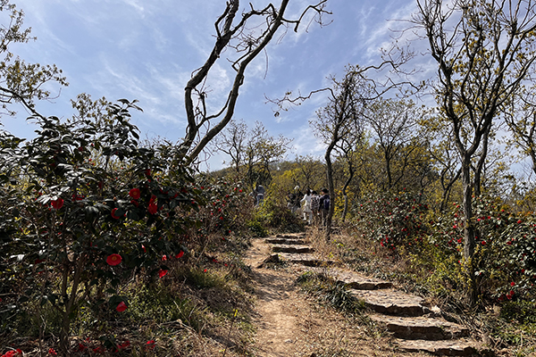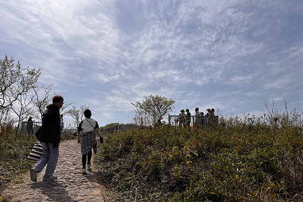 春風裹挾著草木的清氣,在耳畔絮語。天朗氣清,同事們身著輕便裝束,三三兩兩結伴而行,起初石階尚算平緩,還能輕松談笑。行至半路,領頭的幾個年輕人早已不見蹤影,中間的一撥走走停停,不時掏出手機拍照,或是扶著膝蓋喘幾口粗氣。落在后頭的幾位,索性尋了塊平整的石頭坐下,掏出水壺慢飲,倒像是在自家庭院納涼。